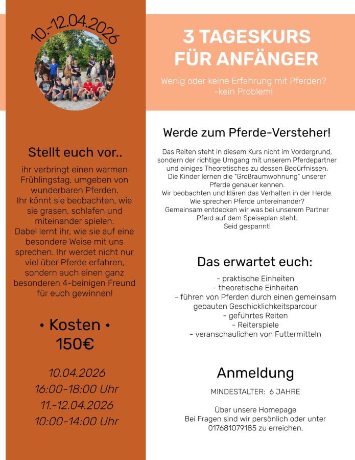3-Tageskurs für Anfänger Veröffentlicht von Old Mill Ranch am 06.01.2026 um 22:55 Uhr | Zuletzt geändert am 06.01.2026 um 22:55 Uhr Zurück zur Übersicht